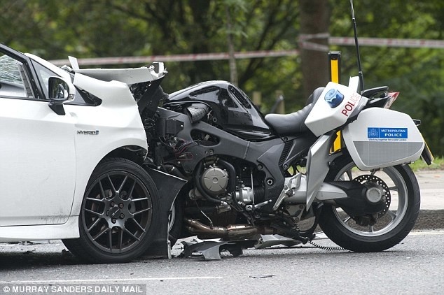 | Đoàn xe hộ tống Hoàng tử Anh Harry gặp tai nạn kinh hoàng trên một tuyến đường ở phía bắc London hôm 11/9 khiến một cảnh sát bị thương. Cú va chạm khiến chiếc mô tô phân khối lớn và chiếc Toyota Prius màu trắng biến dạng. Ảnh: Daily Mail |
