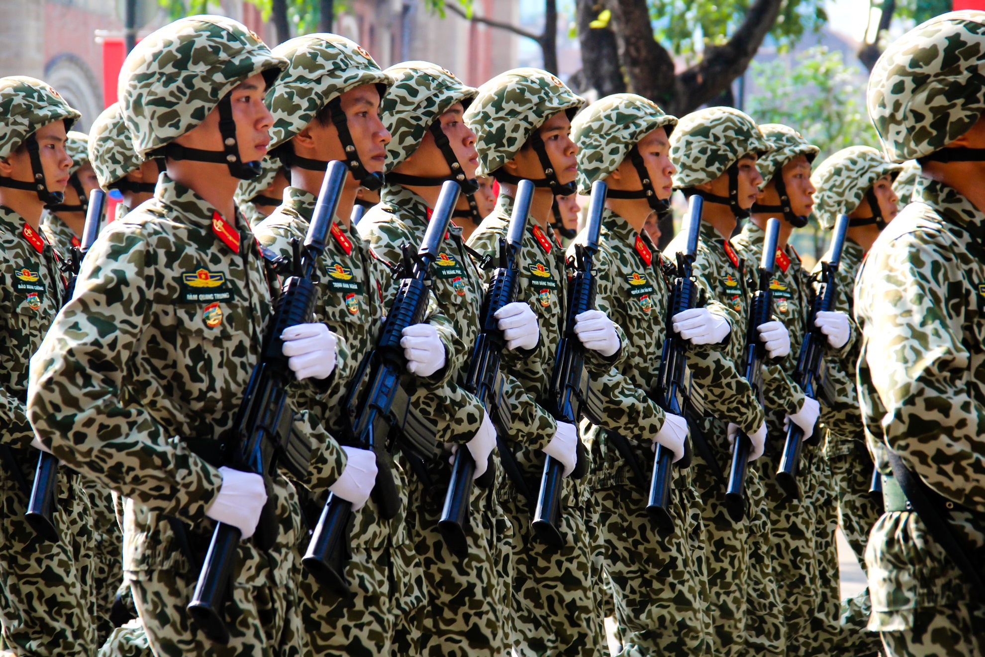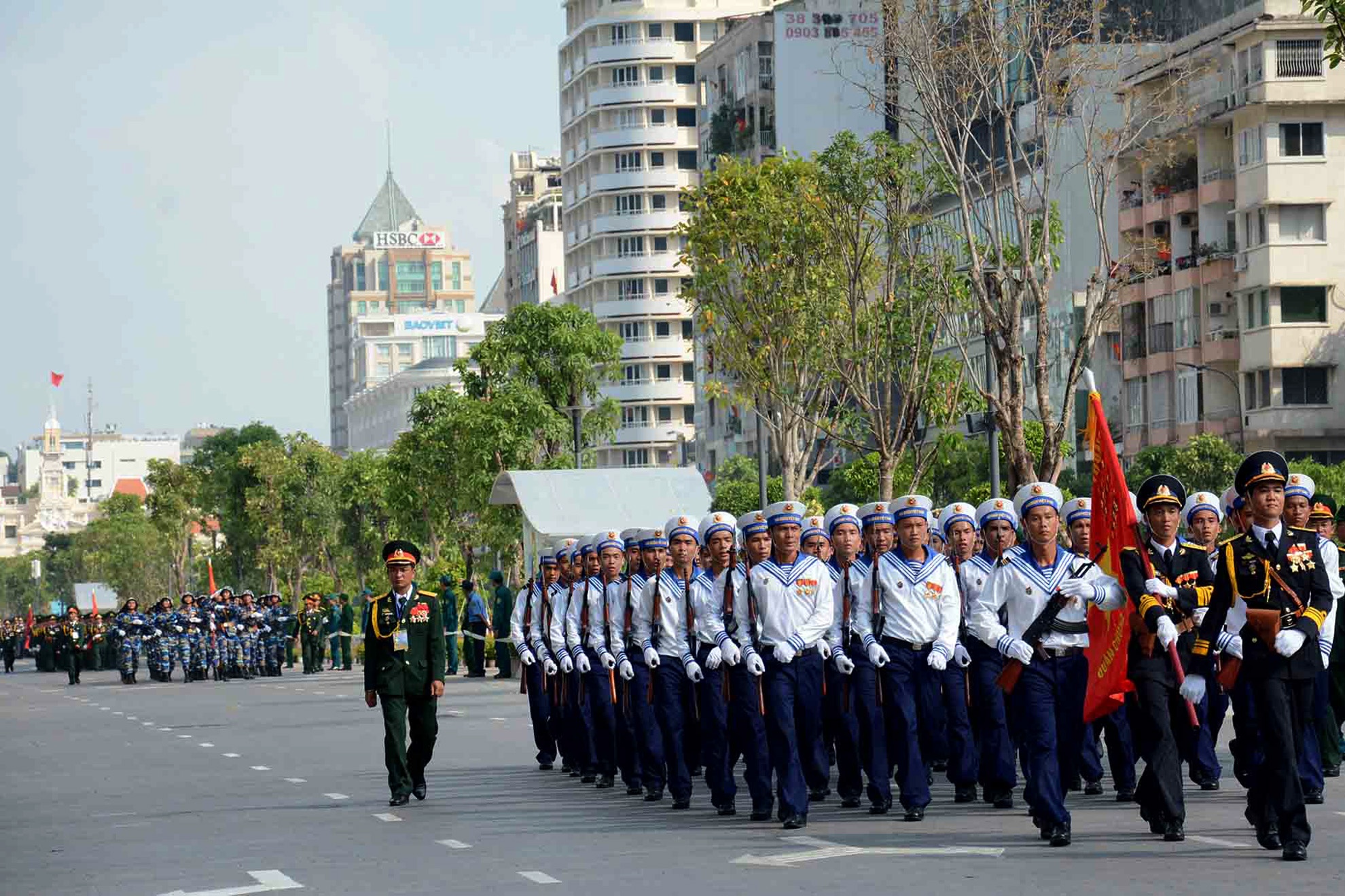 Nghi lễ diễu binh, diễu hành diễn ra lúc 7h30 sáng 30/4 với sự tham dự của 6.000 người. Họ đã phải tập luyện trước đó 3 tháng để có được đội hình cùng các động tác đồng đều. Ảnh: Hải An. Xem thêm