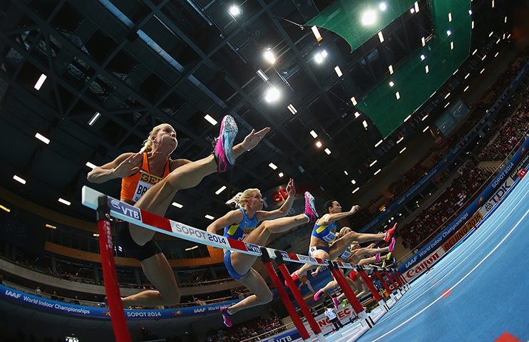 | Nadine Broersen (Hà Lan), Alina Fyodorova và Ganna Melnichenko (cùng của Ukraine) cạnh tranh quyết liệt ở nội dung vượt rào 60m. |
