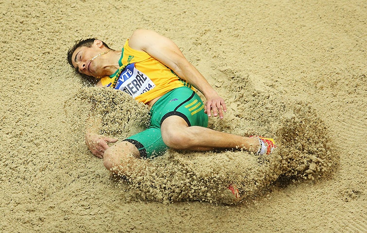 | VĐV Fabrice Lapierre của Australia với bộ mặt biểu cảm sau khi hoàn tất nội dung thi nhảy xa của nam. |