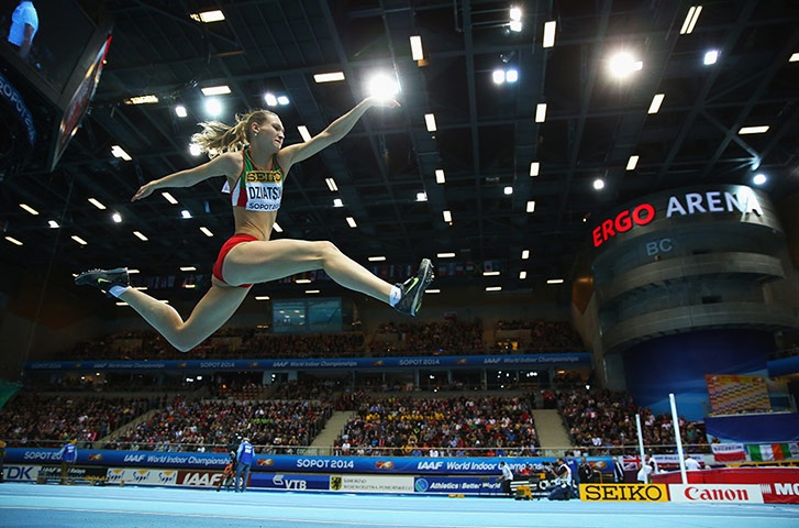 | VĐV Kseniya Dziatsuk thực hiện nội dung thi nhảy ba bước nữ. |