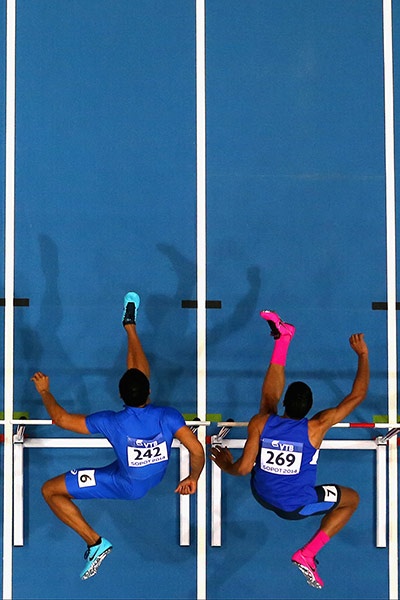 | VĐV Paolo Dal Molin (trái) của Italy so kè quyết liệt với đối thủ Abdulaziz Al Mandeel của Kuwait ở nội dung vượt rào 60m nam. |