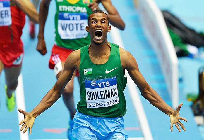 | VĐV Ayanleh Souleiman của Djibouti vui mừng khi cán đích đầu tiên ở nội dung chạy 1.500m nam. |