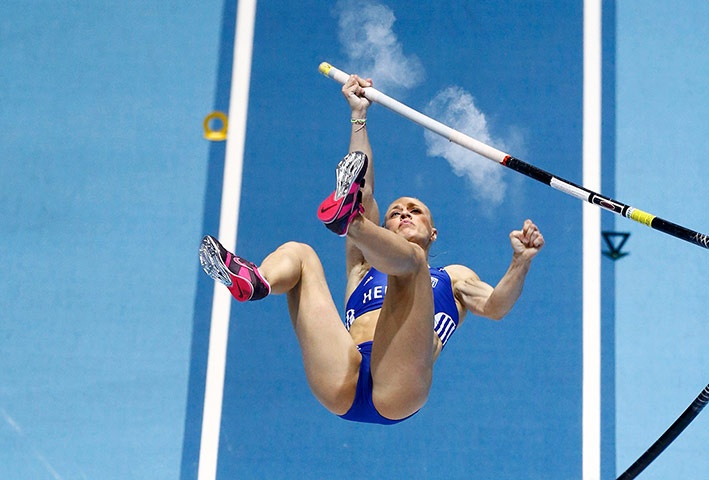 | VĐV Nikoleta Kiriakopoulou của Hy Lạp đang trong quá trình thực hiện nội dung nhảy sào nữ. |