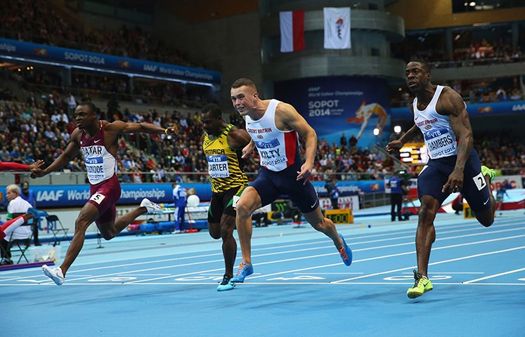 | VĐV Richard Kilty (giữa) của Vương quốc Anh vượt qua người đồng đội Dwain Chambers giành huy chương Vàng ở nội dung chạy 60m nam. |