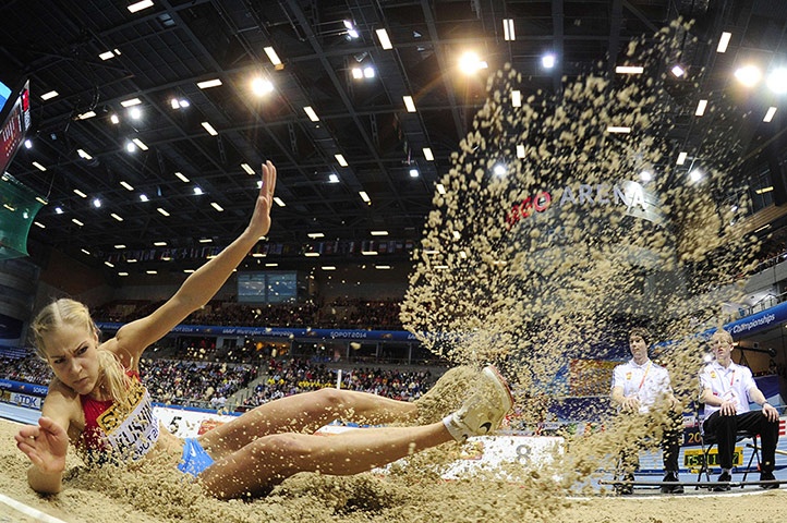 | VĐV Darya Klishina của Nga tiếp đất ở nội dung nhảy xa nữ. |
