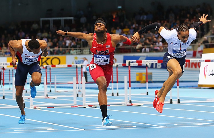 | VĐV Omo Osaghae của Mỹ (giữa) giành HCV ở nội dung vượt rào 60m nam. |