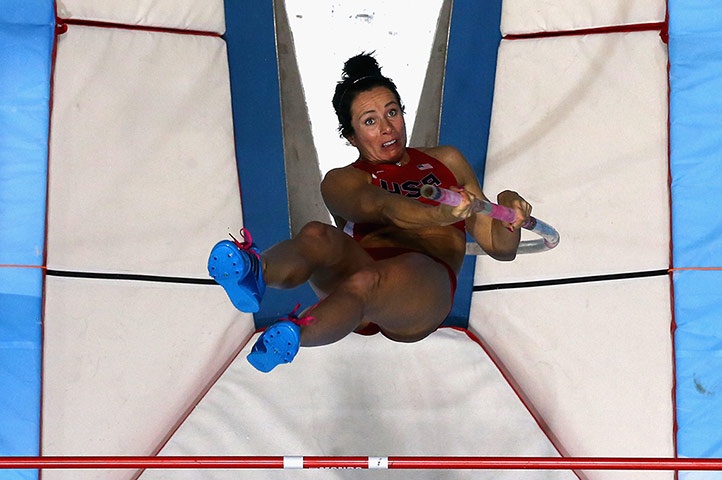 | VĐV nhảy sào Mỹ Jennifer Suhr trong lúc thực hiện phần thi. Sau 3 ngày khởi tranh, tuyển Mỹ dẫn đầu toàn đoàn với 8 HCV, 2 HCB và 2 HCĐ. Xếp thứ 2 là đoàn Nga với 3 HCV, 2 HCB, đoàn Ethiopia xếp thứ 3 với 2 HCV, 2 HCB và 1 HCĐ. |