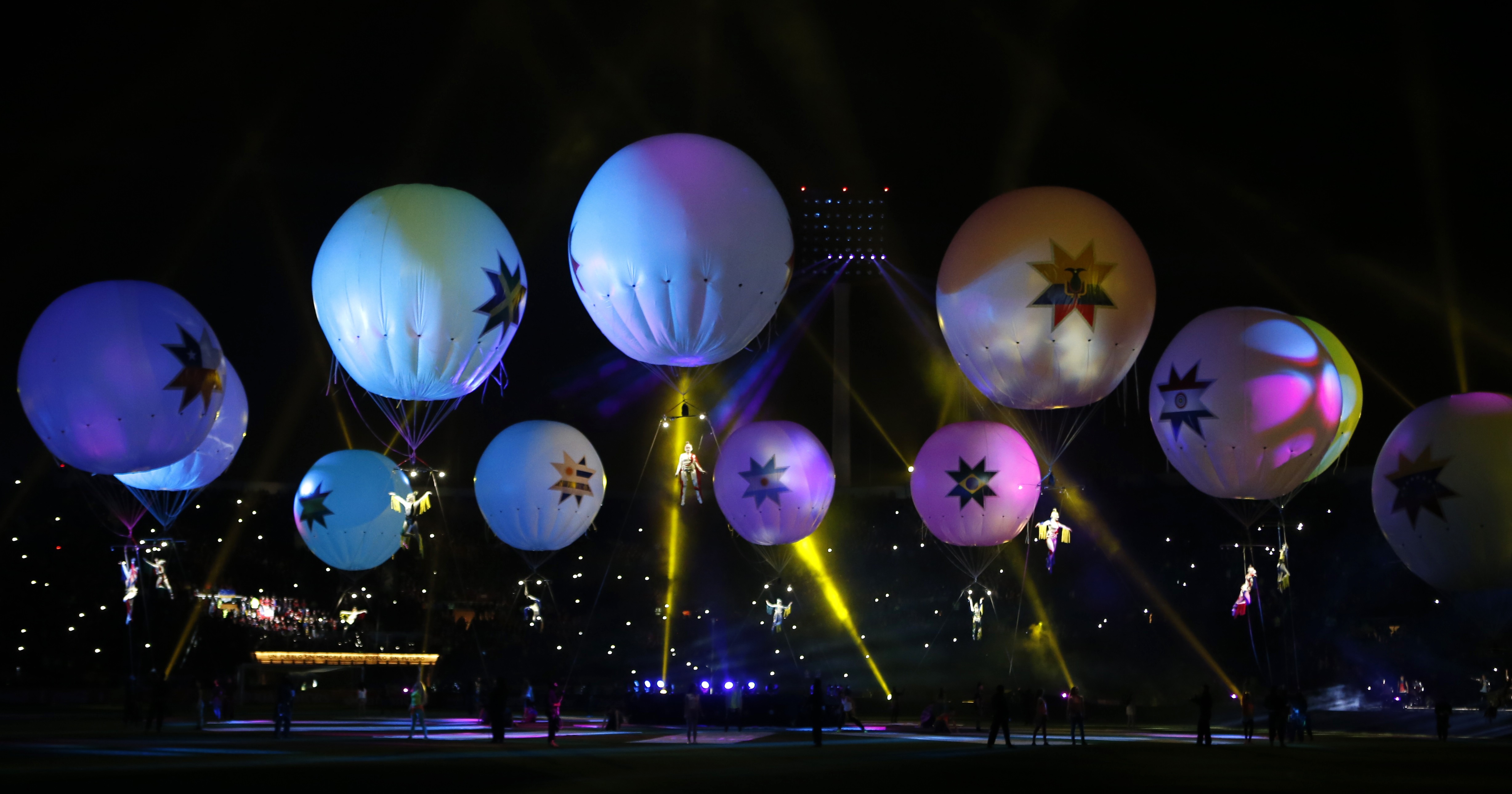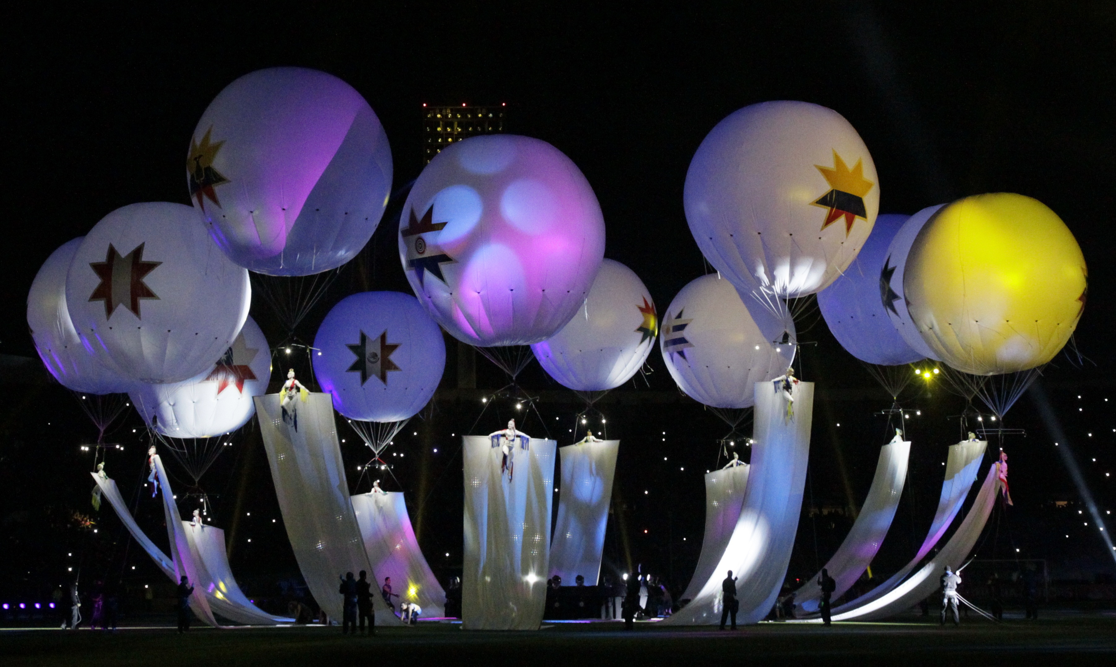 | Những quả bóng bay dạng lớn mang theo cờ của 12 quốc gia tham dự Copa America tung bay trong lễ khai mạc. |
