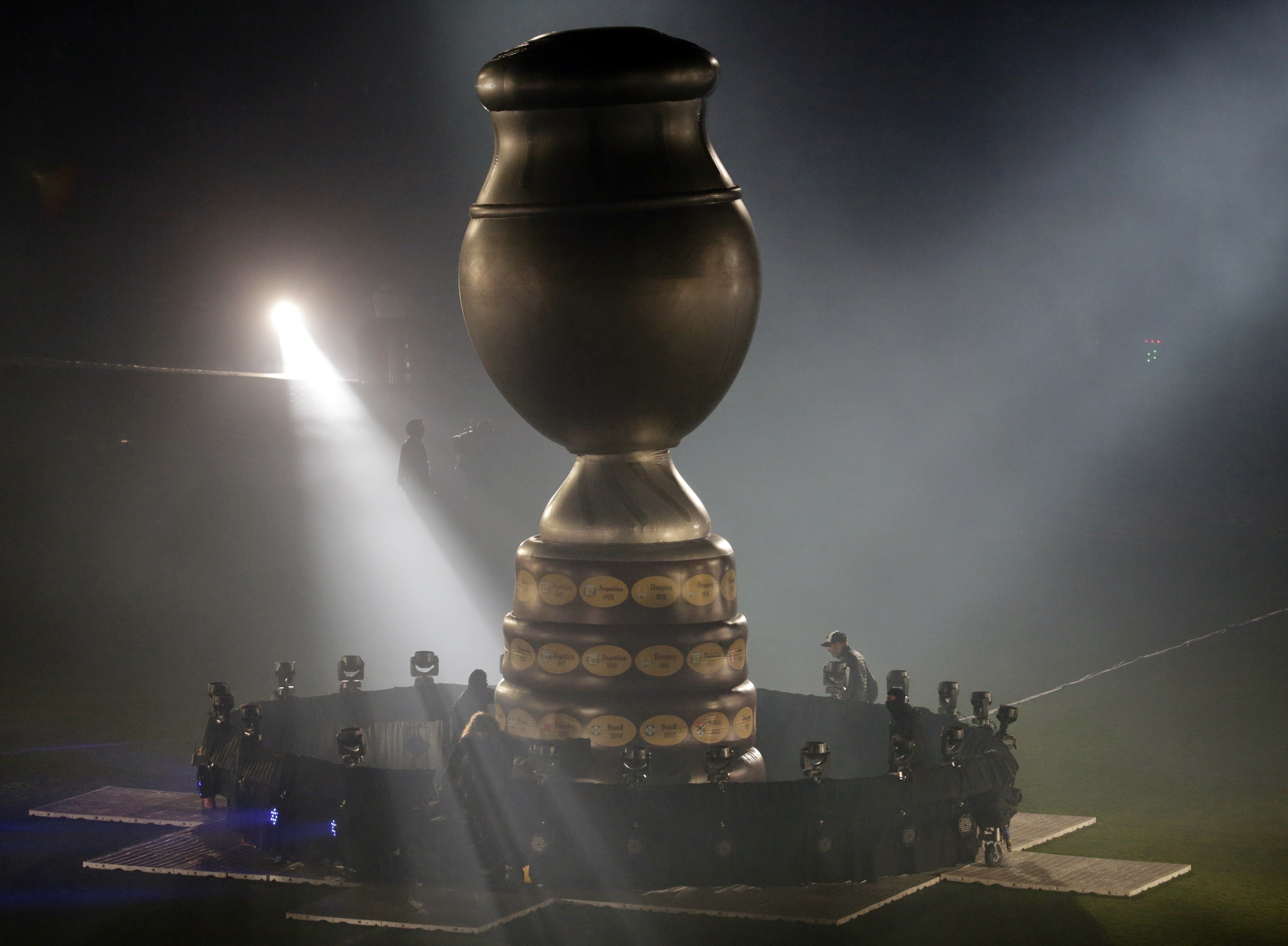 | Một chiếc bình cổ tượng trưng giống như chiếc Cúp được ban tổ chức đưa vào sân để trình diễn. |