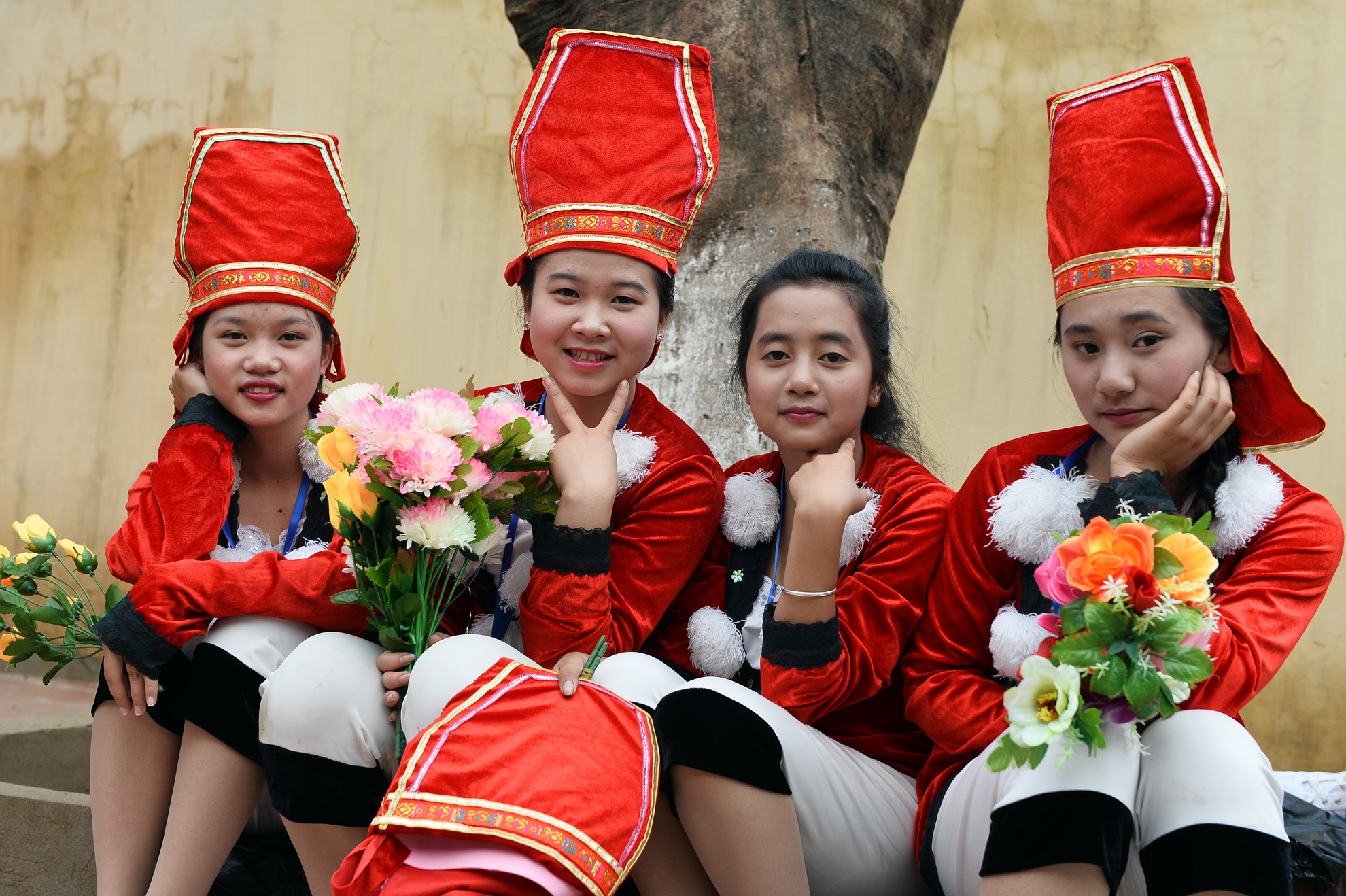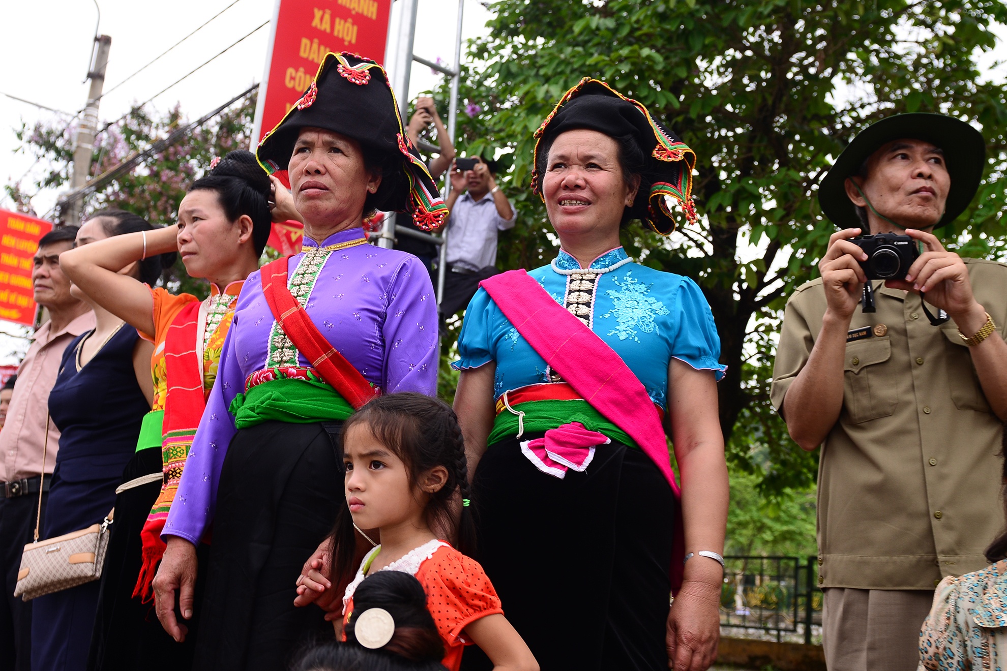 Các em học sinh trường Thanh Chăn trong bộ trang phục người Dao đỏ cho biết, phải tập kết từ 5h sáng, hơi mệt nhưng vẫn vui sướng vì lần đầu tiên được tham gia một nghi lễ trọng thể tại quê hương mình.