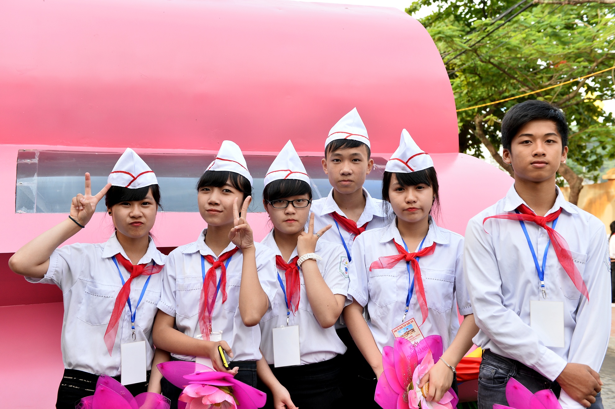Nhóm học sinh lớp 9 trường THCS Tân Bình vinh dự được theo xe ảnh Chủ tịch Hồ Chí Minh.