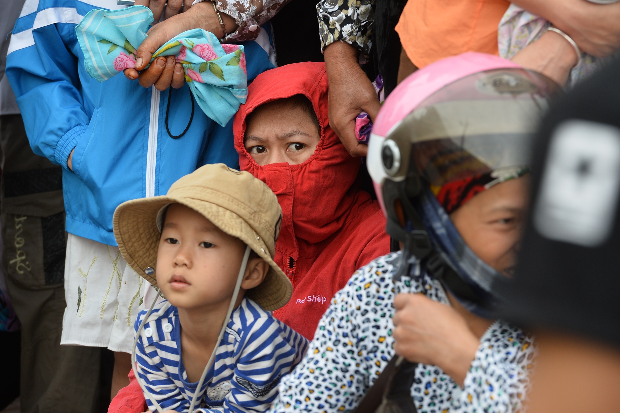 Bé Hoàng Long được mẹ cho đi xem diễu binh. Chị Hà, mẹ của cháu (áo đỏ) kể ngày 7/5 toàn bộ công chức, viên chức ở Điện Biên đều được nghỉ làm hết nên mới có thời gian ra vỉa hè ngồi chờ từ sớm.