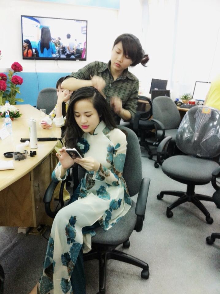 | MC thời tiết Ngọc Bích cũng được chăm sóc "chân tơ kẽ tóc" trước giờ lên sóng. |