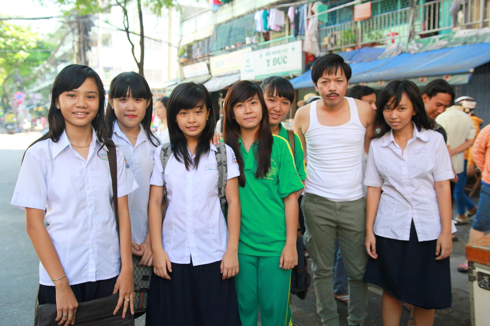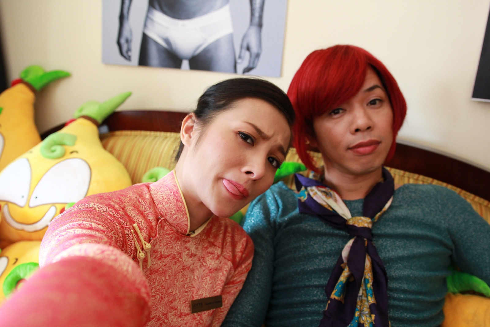 | Diễn viên Huy Khánh và Thái Hòa tự sướng sau một cảnh quay thuộc trường đoạn đầu phim, khi chị Hội vừa mới trở về Việt Nam. |