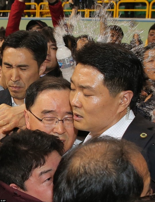 | Thủ tướng Hàn Quốc bị thân nhân hành khách ném chai nước hôm 17/4/2014 ở đảo Jindo. Thảm kịch thổi bùng lên sự phẫn nộ trong dân chúng Hàn Quốc. Họ cho rằng, phản ứng chậm chạp của giới chức nước này đã biến vụ chìm tàu gần bờ thành tai nạn hàng hải nghiêm trọng nhất Hàn Quốc trong 2 thập kỷ qua. Ảnh: AP |