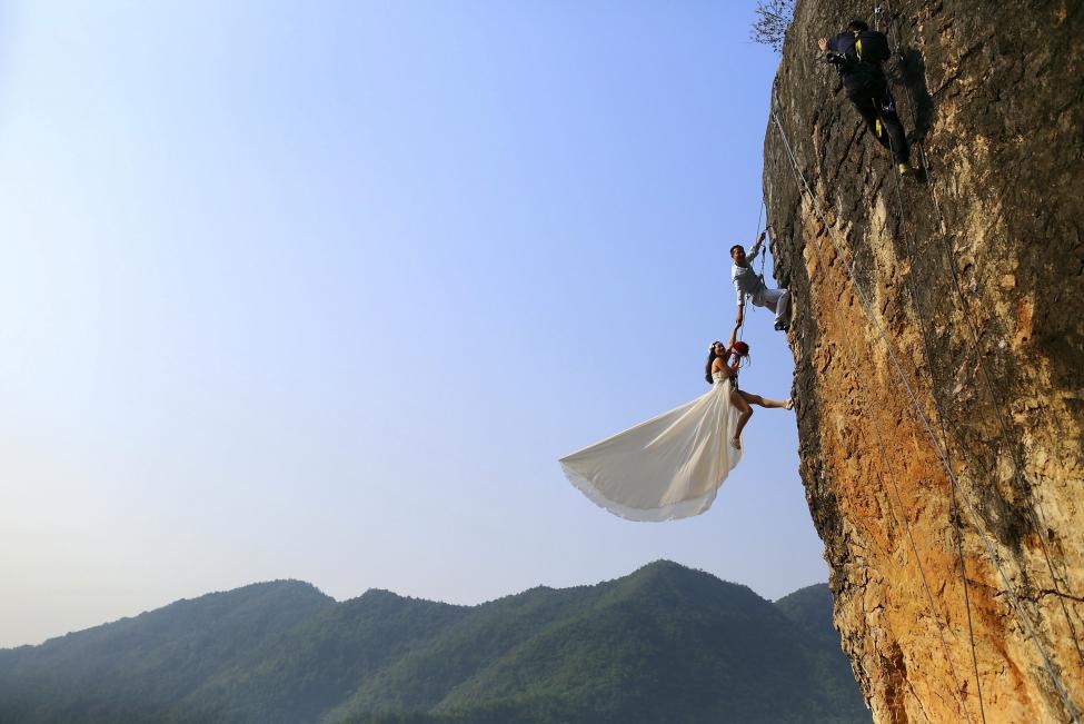Tấm ảnh cưới độc đáo của tay leo núi nghiệp dư Zheng Feng tại Kim Hoa, tỉnh Chiết Giang, Trung Quốc ngày 26/10. |