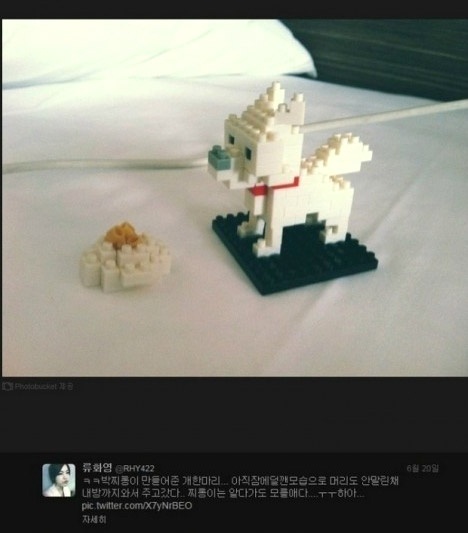 Một lần Hwa Young đăng lên blog hình ảnh một chú cún đứng trước "bữa ăn" bằng lego và nói rằng đây là món quà của Ji Yeon. Tuy nhiên, hình ảnh này có vẻ như không được đẹp!