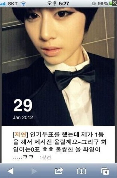 Sau khi chiến thắng trong một cuộc bình chọn online, Ji Yeon đã sung sướng chia sẻ trên blog: "Tôi giành vị trí số 1 trong một cuộc bình chọn về độ nổi tiếng vì vậy tôi đăng hình ảnh này của mình. Hwa Young không có phiếu bầu nào. Tội nghiệp Hwa Young của chúng ta... keke!".