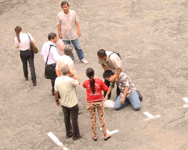 | Mẹ của Tuyến nằm gục bên sân tòa khi con lãnh án tử hình. |