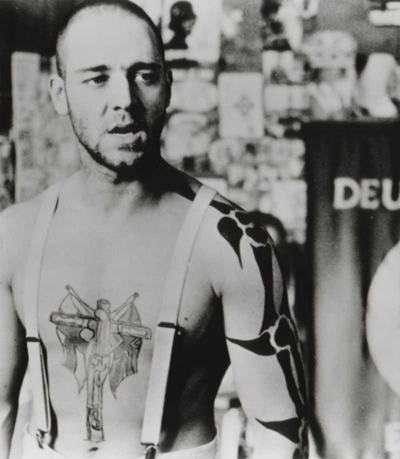 Russell Crowe trong Romper Stomper (1992): Trước khi được vinh danh qua Gladiator hay A Beautiful Mind, tài tử người Úc từng hóa thân thành một gã đầu trọc ưa bạo lực trong bộ phim ra mắt hồi năm 1992. Đây là một thanh niên có tư tưởng chính trị lệch lạc, sở hữu nhiều hình xăm đáng sợ trên cơ thể, nhất là bộ xương bên tay trái - thể hiện rõ bản chất hung hăng của y. |