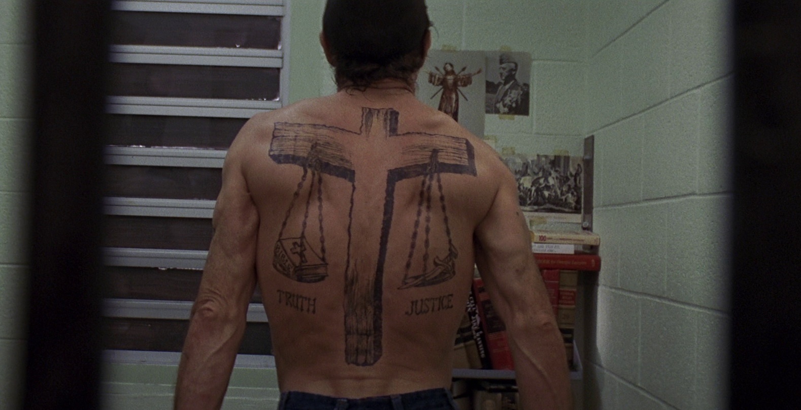 Robert De Niro trong Cape Fear (1991): Trong phim, nam diễn viên gạo cội Robert De Niro vào vai một tên phạm tội từng có tiền án về tội cưỡng bức phụ nữ. Hắn vốn là một gã ma cô vô học, nhưng trong thời gian ở tù, hắn đọc nhiều sách và trở nên thông tuệ về luật pháp, tôn giáo, triết học. Ra khỏi trại giam, hắn còn mang theo nhiều hình xăm kỳ quái trên thân mình. Điển hình là hình xăm cây thánh giá, với hai bên là hình ảnh đại diện cho công lý và sự thật ở trên lưng. |