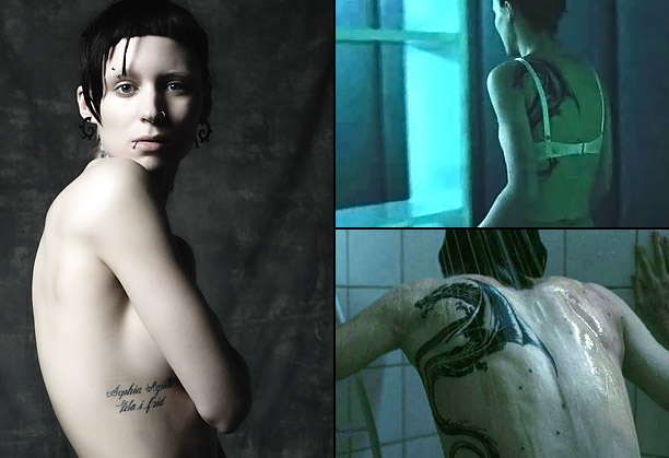 Rooney Mara trong The Girl With the Dragon Tattoo (2011): Trong bộ phim tâm lý hình sự phiên bản làm lại của đạo diễn David Fincher, cô đào Rooney Mara thủ vai cô gái Lisbeth Salander có vẻ ngoài hết sức cá tính. Đúng như tựa đề của phim, cô gái cao thủ hacker có hành tung bí ẩn cùng một hình xăm rồng lớn trên lưng trái. Hình xăm này của Lisbeth Salander biểu tượng cho sự mạnh mẽ bên trong nhân vật, cùng ước muốn muốn trả thù những kẻ từng chà đạp cô trong quá khứ. |