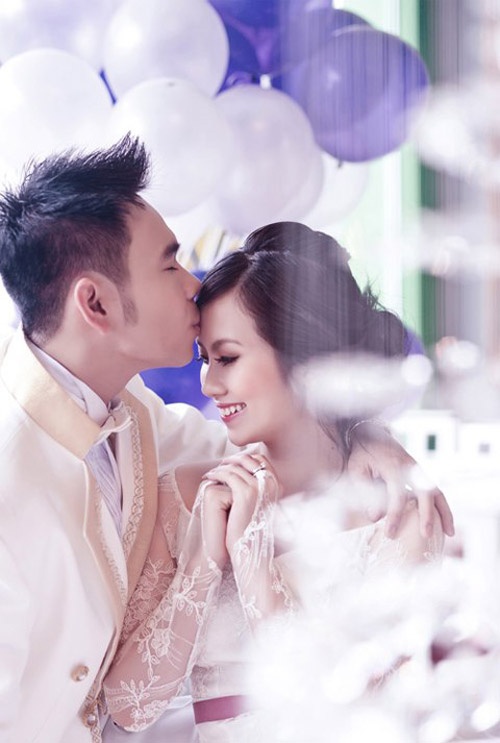 | Huyền Trang hạnh phúc bên người chồng là ca sĩ Triệu Hoàng. |