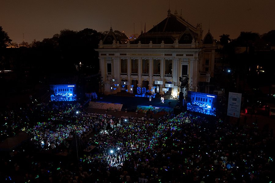 | Ngay từ 19h, trước thời khắc diễn ra nghi thức bấm nút tắt đèn hơn một tiếng, quảng trường Cách mạng tháng Tám đã đông đúc người dân, trong đó chiếm phần lớn là các thanh niên, sinh viên. |