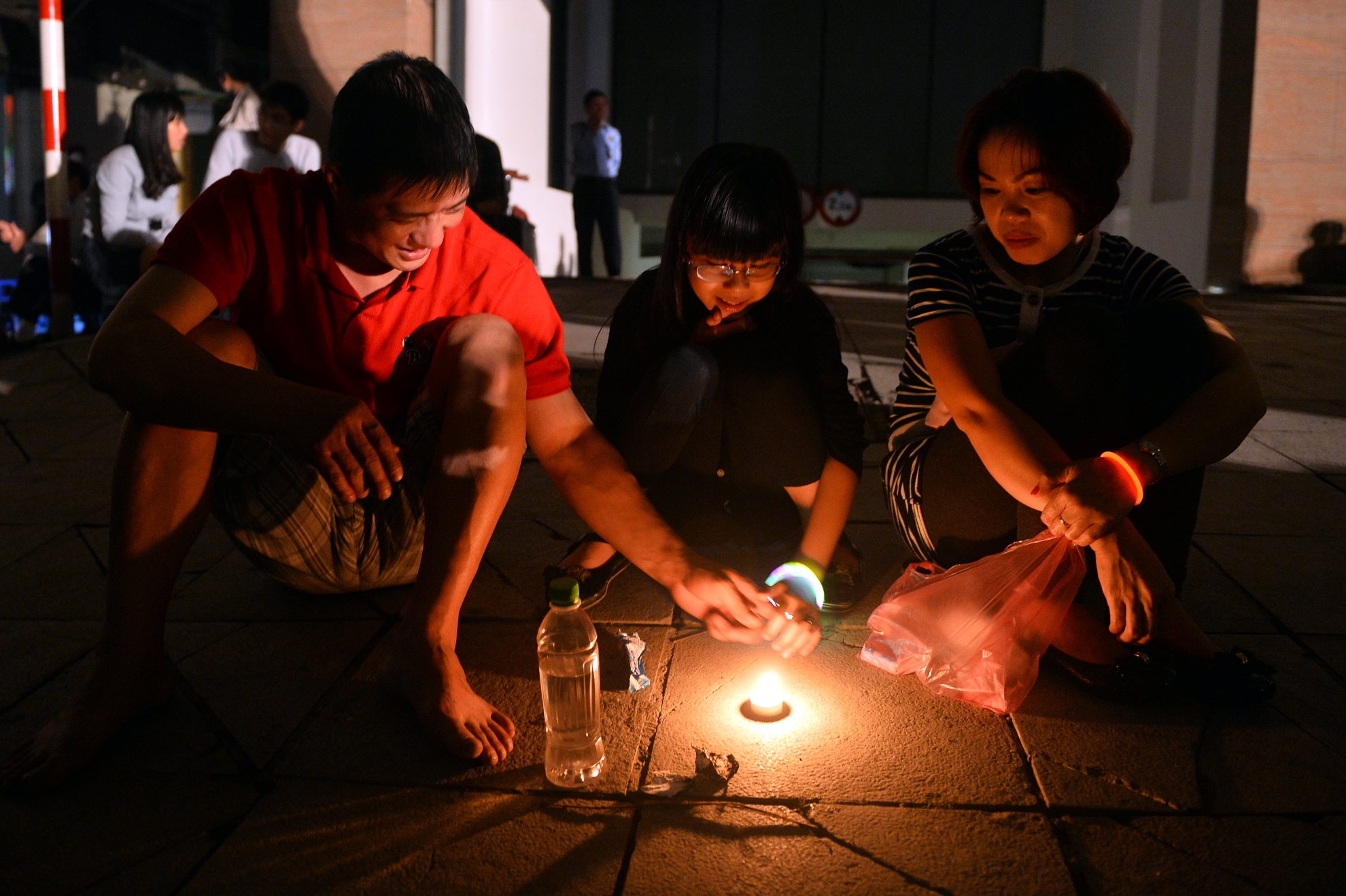 | Toàn cảnh quảng trường Cách mạng tháng tám, chỉ còn ánh sáng từ điện thoại di động và vòng đeo tay. |