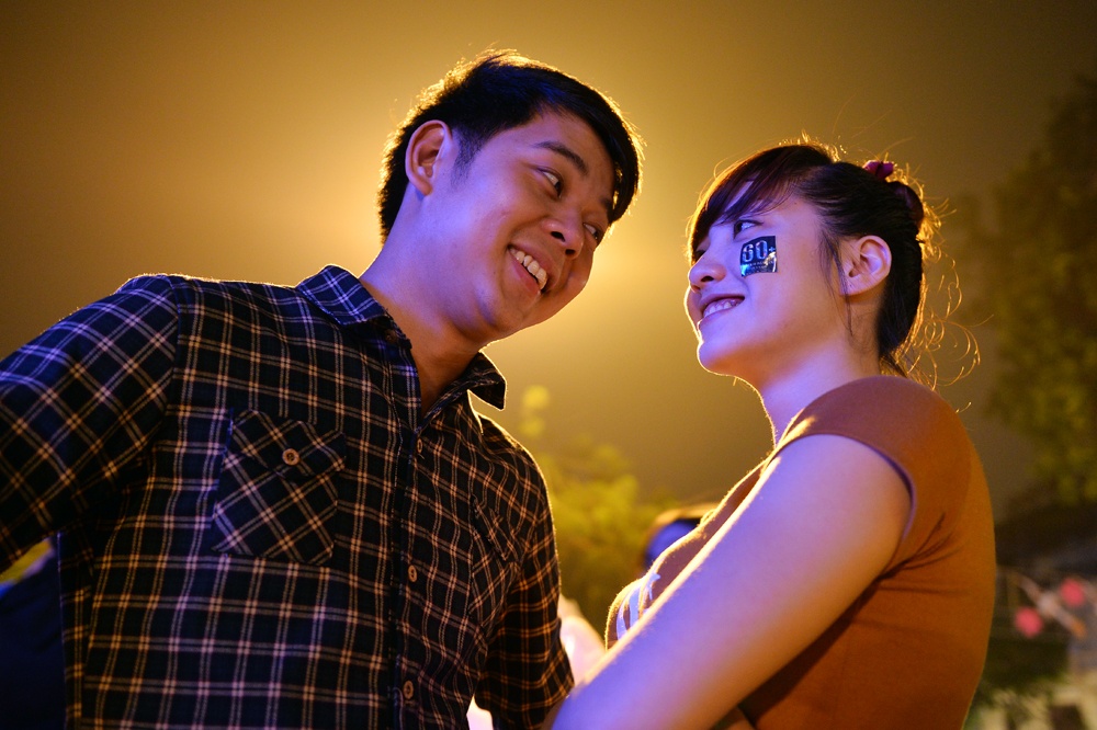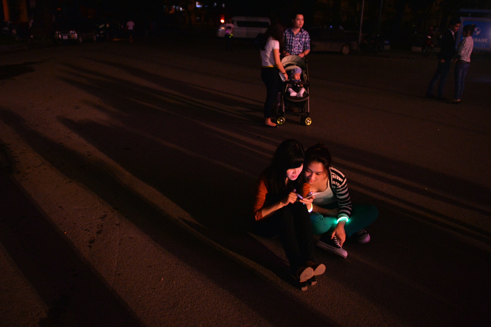 | Đôi bạn trẻ Bùi Thị Quyên, Nguyễn Mạnh Quân, sinh viên đại học Sư phạm Hà Nội hào hứng trước giây phút tắt đèn. |