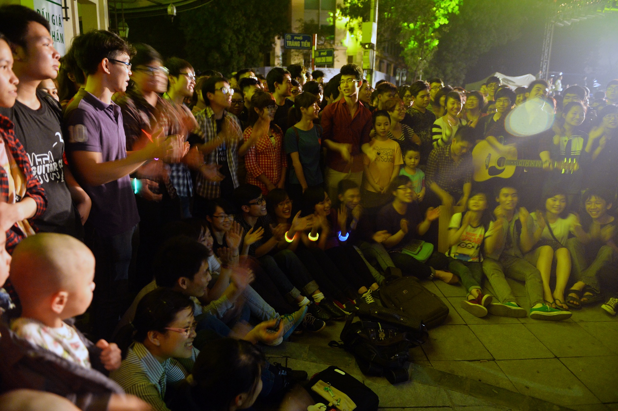 | Một nhóm thanh niên tổ chức hát tập thể bài "Anh không đòi quà" thu hút đông đảo người dân đón xem. |