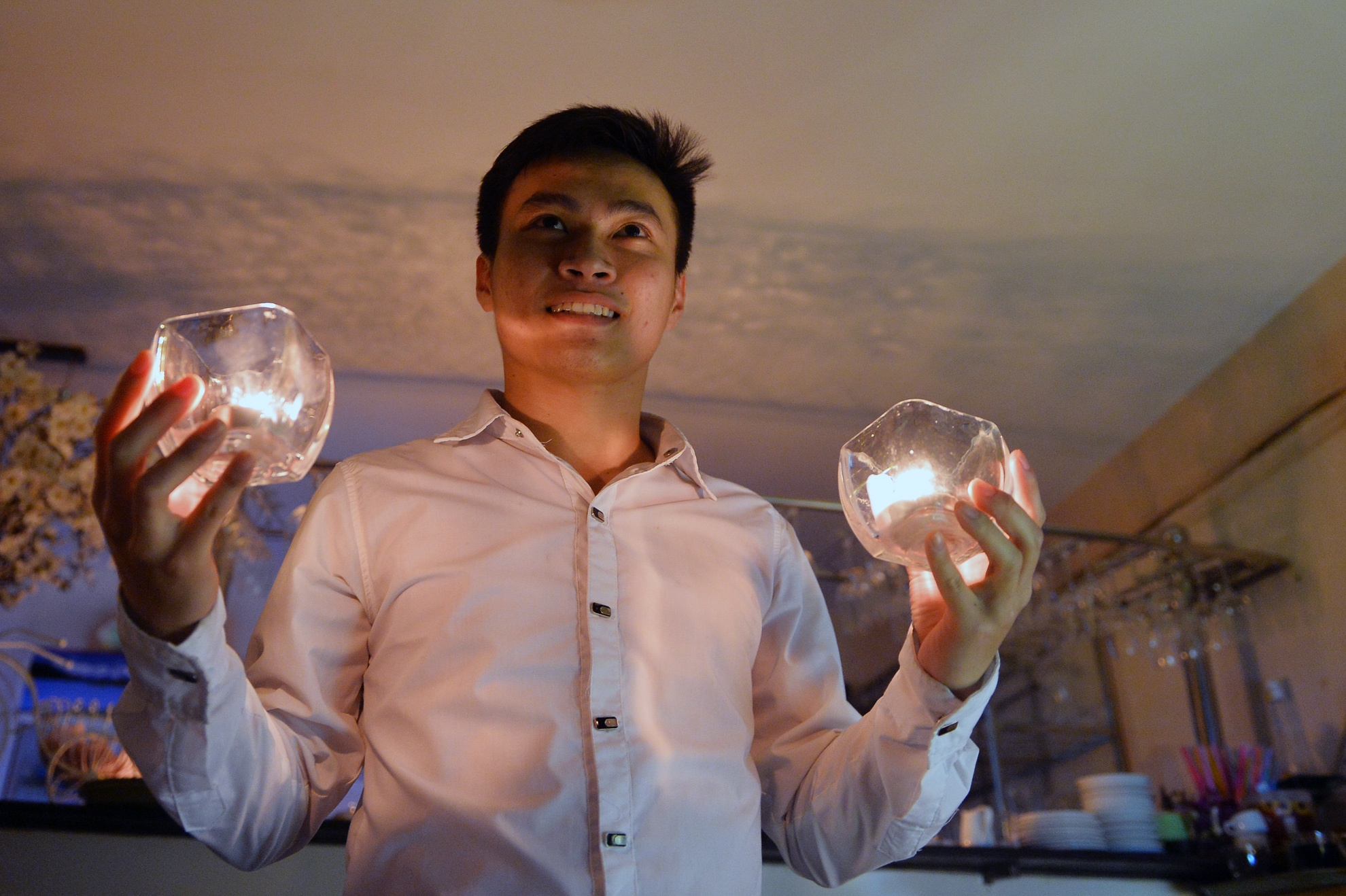 | Em Nguyễn Mạnh Hưng, một học sinh THPT đã nghĩ ra cách chế bộ phát ánh sáng đeo vào kính cận mang đi chơi. |