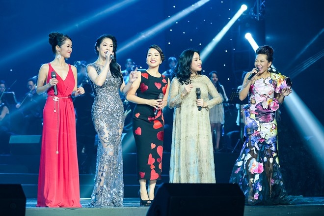 | 9. Bốn diva nhạc nhẹ của Việt Nam bao gồm Thanh Lam, Hồng Nhung, Mỹ Linh, Hà Trần cùng nữ ca sĩ Thu Phương trên sân khấu Master of Symphony. Đây được xem là khoảnh khắc đặc biệt trong năm không chỉ mới sự công phu của chương trình mà còn ở sự hội tụ của những giọng ca đẳng cấp nhất của Vpop. Ảnh: Nguyễn Bá Ngọc. |