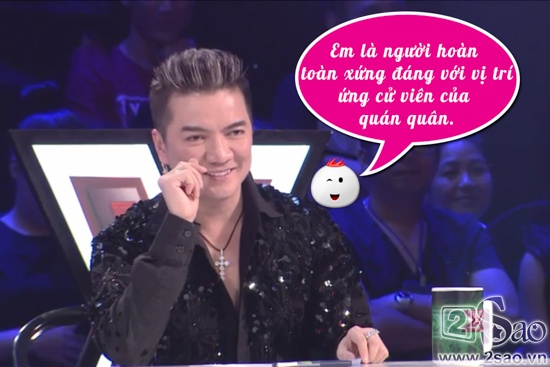 | Trước phần nhận xét của các giám khảo, MC Nguyên Khang luôn ưu ái dành tình cảm của mình cho Hồ Ngọc Hà khiến Mr. Đàm cũng phải thốt lên: “Anh thấy em lạ lùng lắm. Lần trước thì thích Dương Khắc Linh, hôm nay thích Hồ Ngọc Hà là sao?”. |