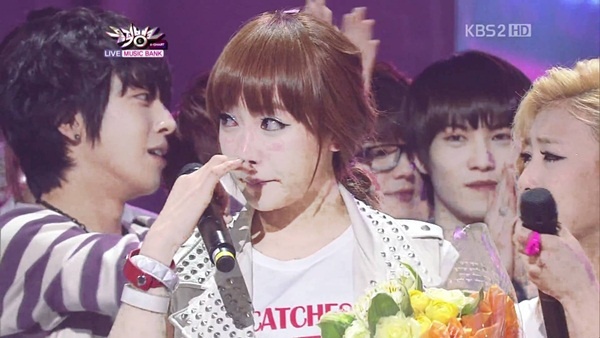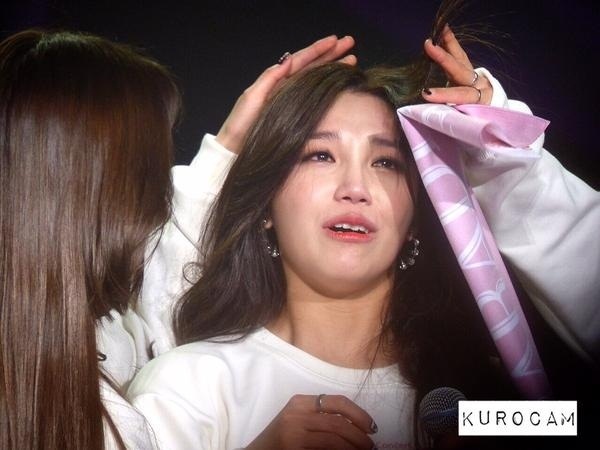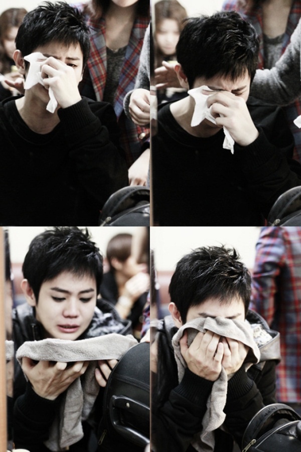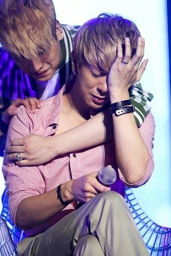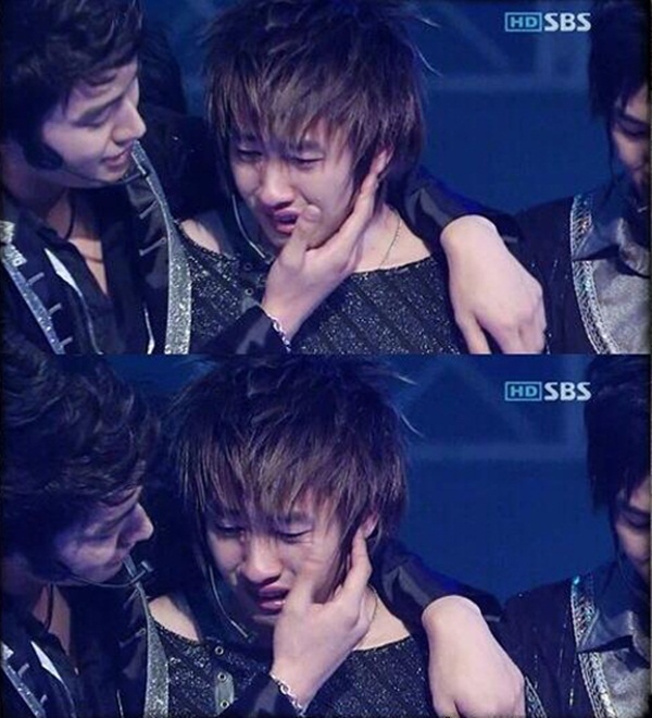 | Có một bộ phận khán giả không thể rời mắt khỏi sân khấu chỉ vì anh chàng, cô nàng mà họ thích mặc một bộ đồ rất đẹp, hoặc có những người lại đắm chìm trong giai điệu của bài hát, một số khác lại chăm chú với những màn vũ đạo nóng bỏng. Nhưng những khoảnh khắc thần tượng khóc trên sân khấu lại chính là 'đòn chí mạng' đánh vào trái tim khán giả. Hyunbin khóc nức nở trong ngày nhập ngũ. |