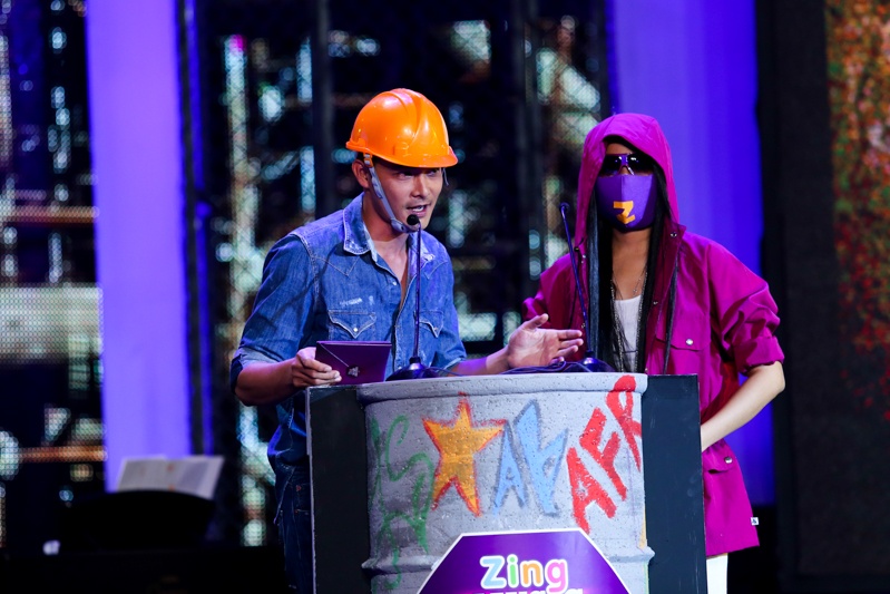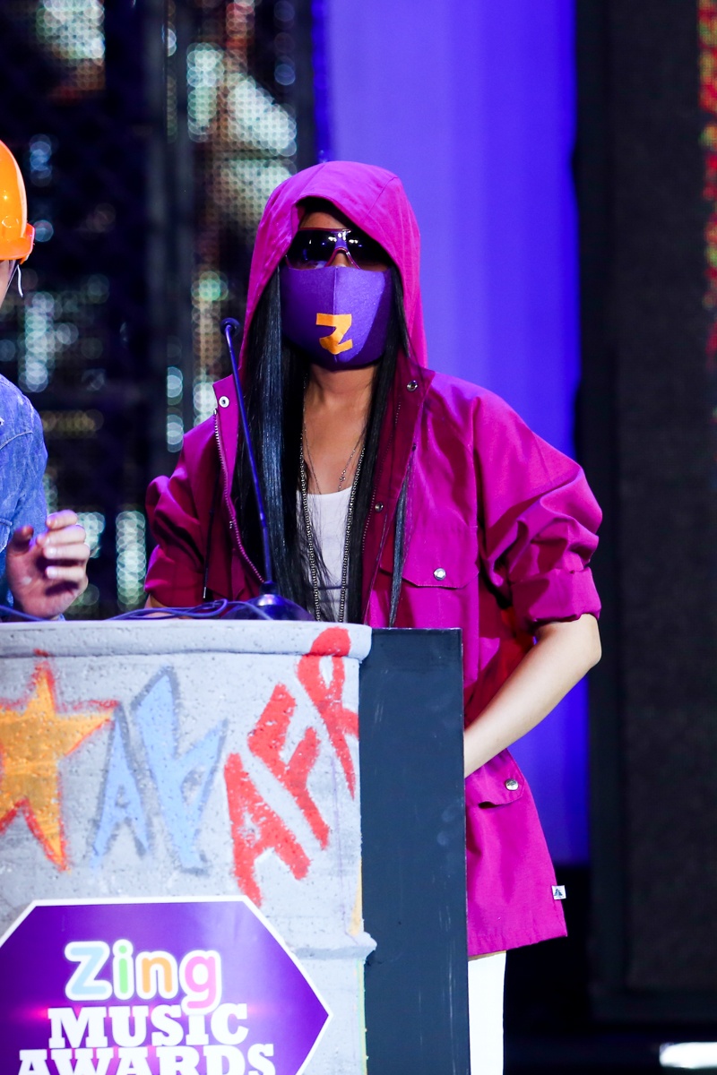 Khán giả ngạc nhiên vì khách mời ăn mặc kín mít, đeo khẩu trang lên sân khấu. |