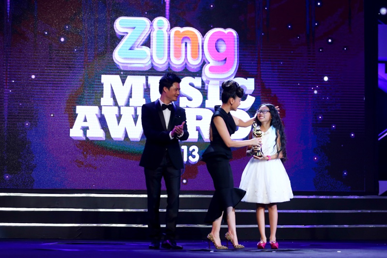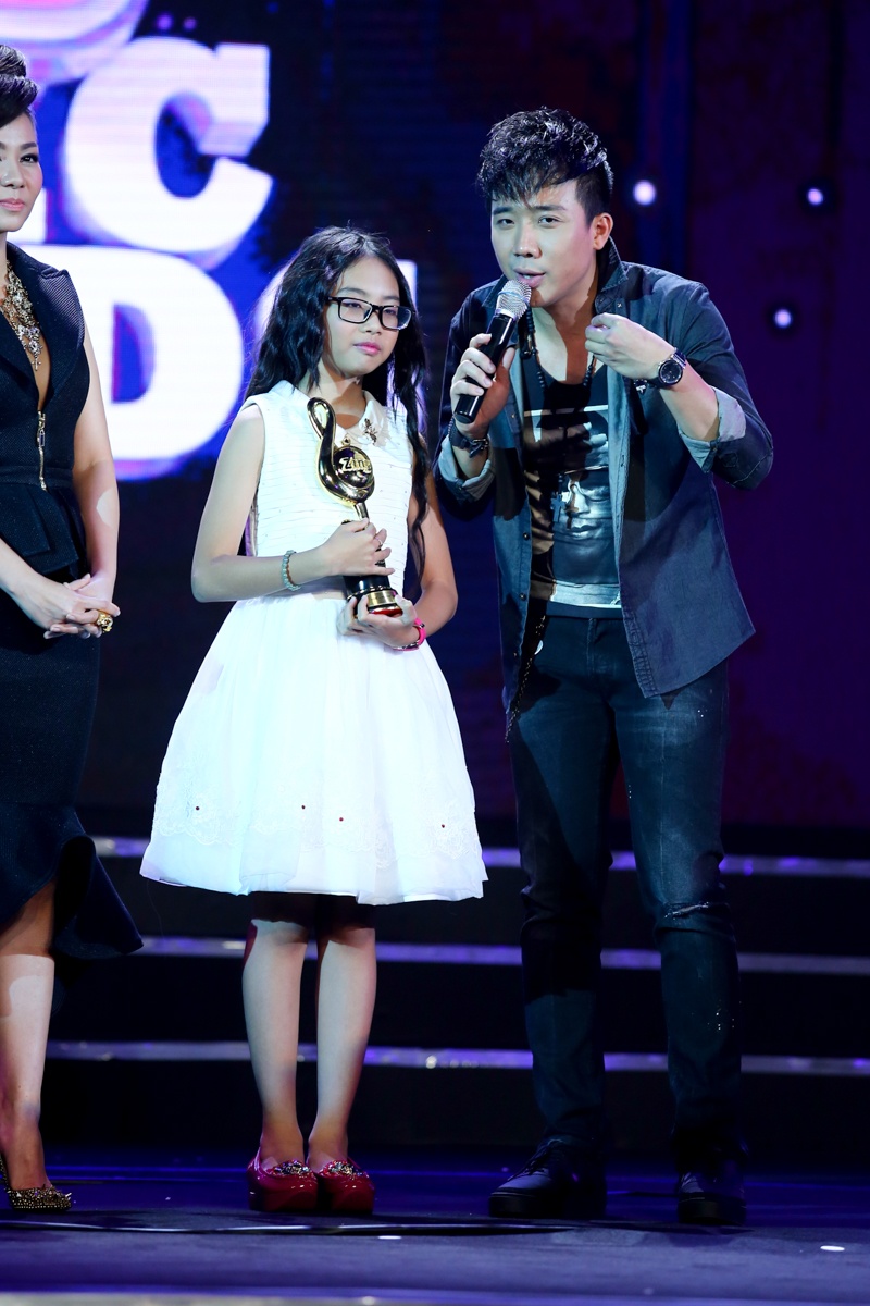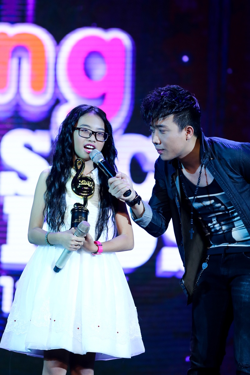 Hai ca sĩ nổi tiếng vui sướng trao giải thưởng Nghệ sĩ mới được yêu thích nhất cho Phương Mỹ Chi. Cả Quang Dũng và Thu Minh đều theo dõi cuộc thi Giọng hát Việt nhí nên rất yêu quý cô bé hát dân ca. |