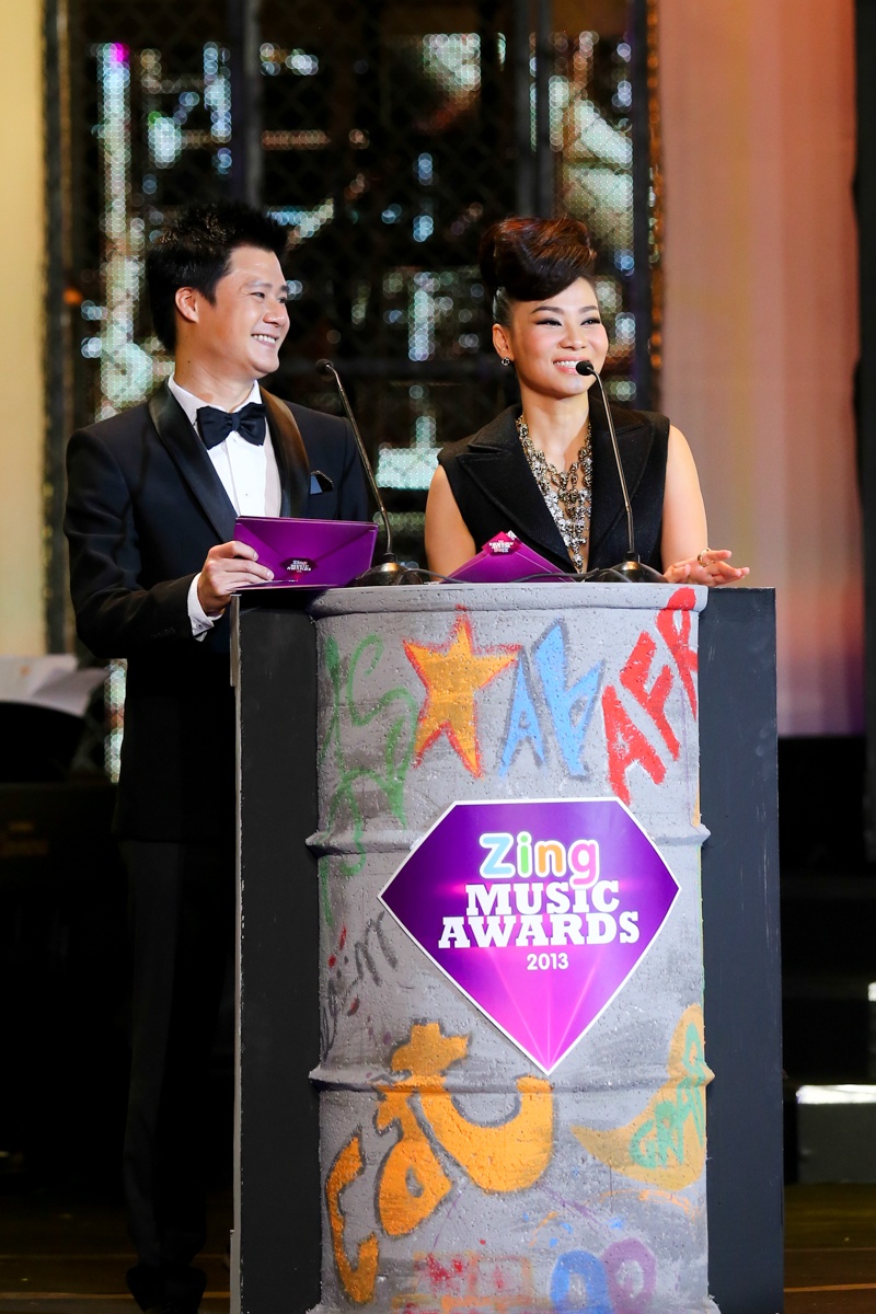 Quang Dũng và Thu Minh ton sur ton ra chào khán giả khi làm khách mời trao giải Nam/ Nữ ca sĩ được yêu thích nhất và Nghệ sĩ mới xuất sắc nhất trong đêm Gala trao giải ZMA tối 7/1. |
