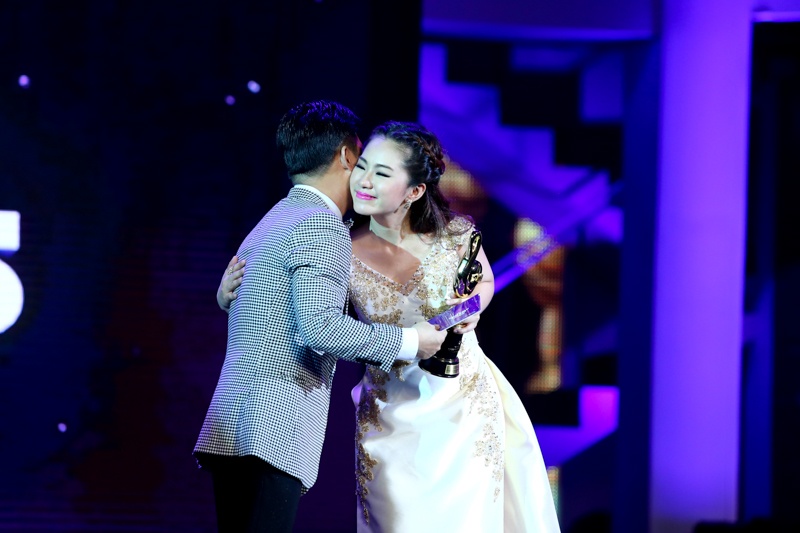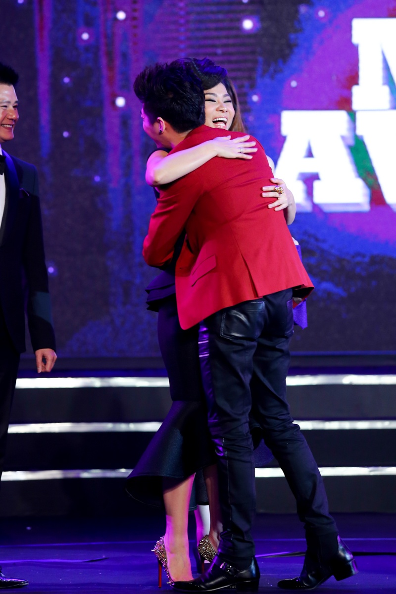 Noo Phước Thịnh thắng giải Nam ca sĩ được yêu thích nhất. Anh sung sướng ôm chầm lấy Thu Minh khi được chị trao cup chiến thắng. |