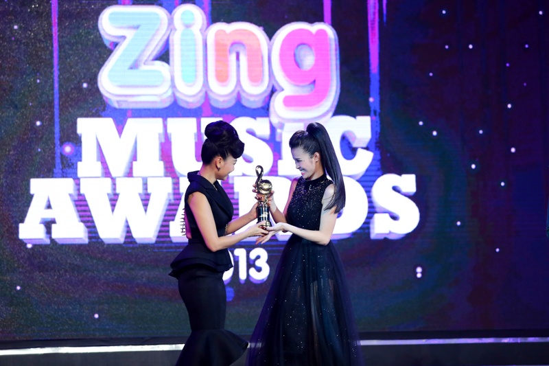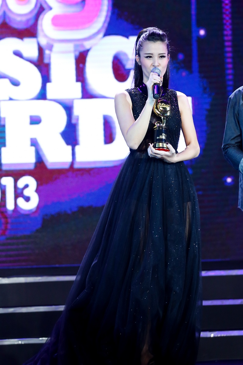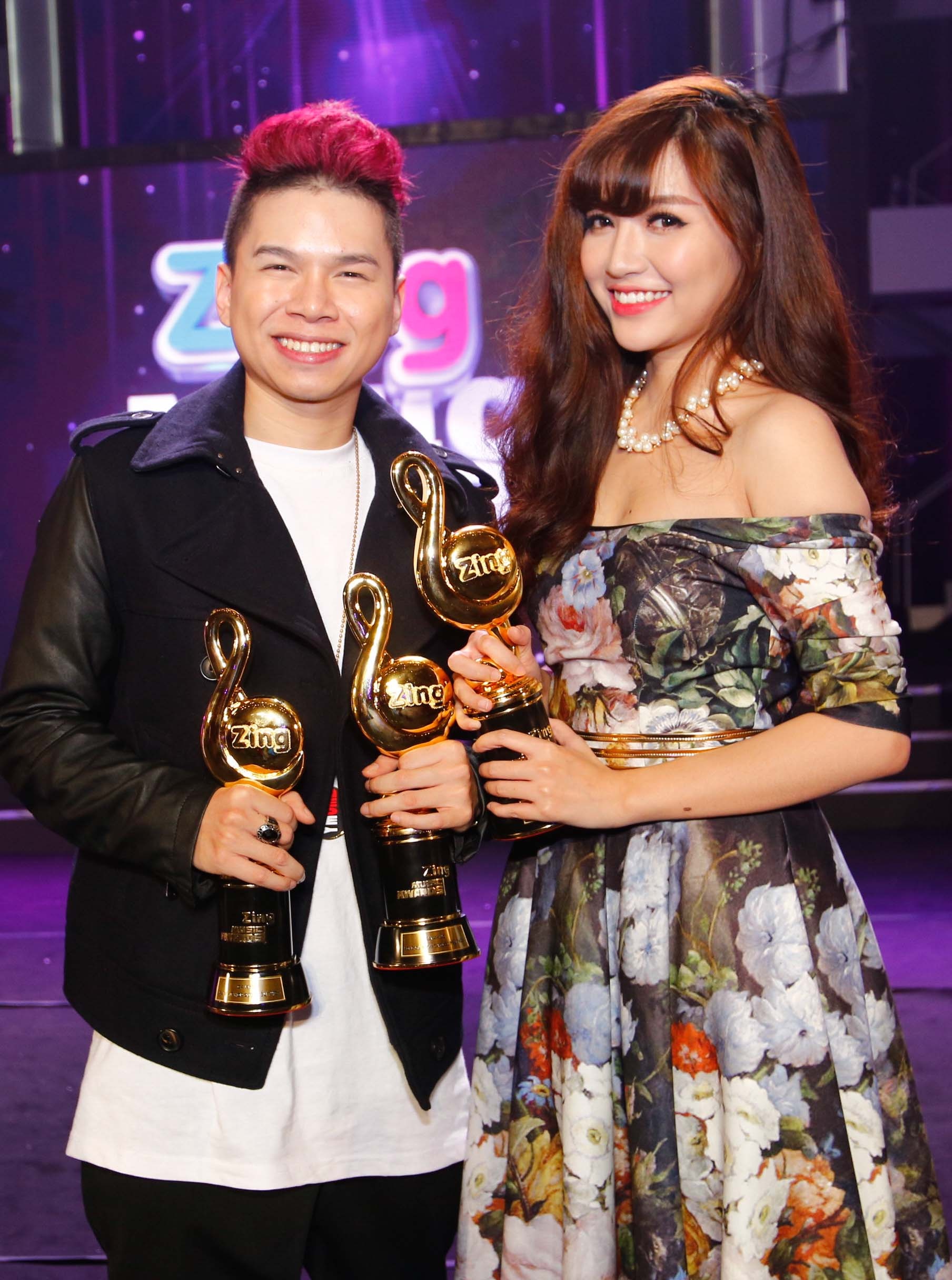 Nữ ca sĩ xinh đẹp khoe cúp với Hoàng Tôn. |