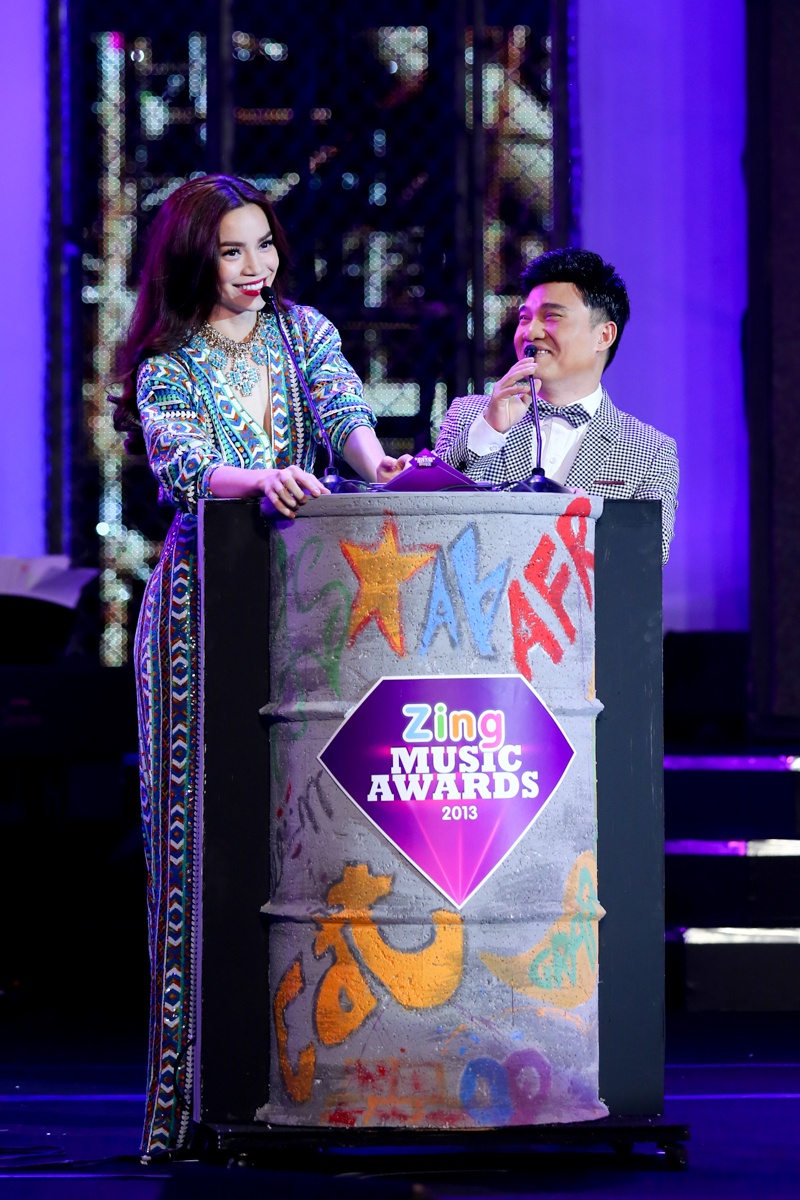 Quang Linh vừa bước ra sân khấu trao giải cùng Hồ Ngọc Hà đã cảm nhận được "những nụ cười bí hiếm" của khán giả về sự chênh lệch giữa anh và người đẹp. Nhưng chân dài "không thèm quan tâm" vì cả 2 có mối quan hệ khăng khít. |