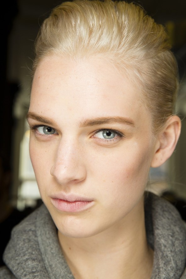 | Các người mẫu hầu như không trang điểm trong show của Alexander Wang trừ chân mày nhuộm vàng nhat và da mặt được đánh phấn mịn. Thay vào đó, tóc người mẫu được dành nhiều thời gian hơn với phần mái kéo hết sang một bên và nhét gọn vào áo khoác cho vẻ đẹp thật futuristic. |