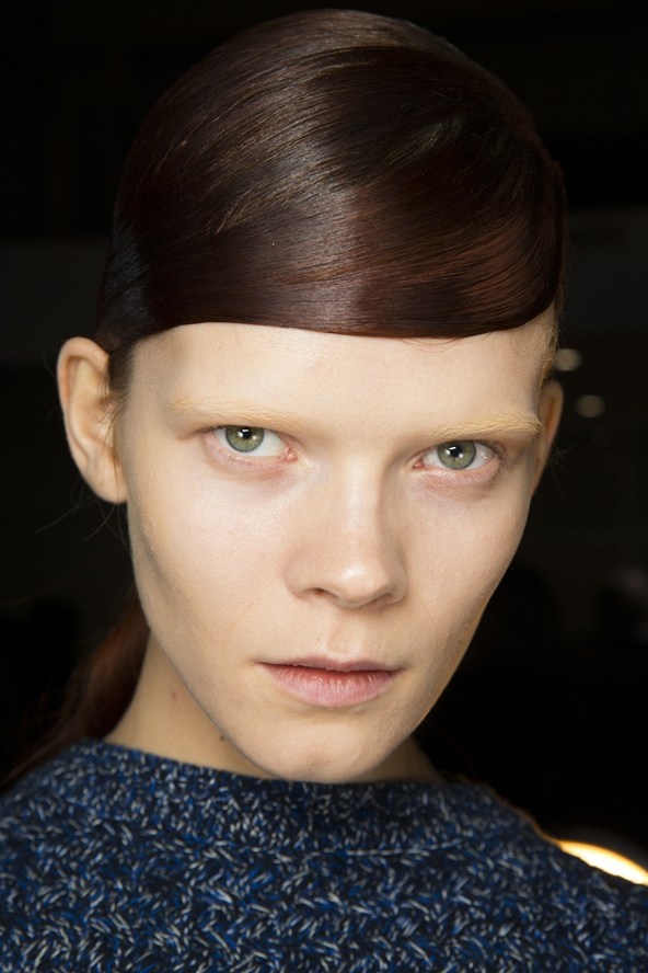 | Điểm nhấn của phong cách trang điểm trên sàn diễn của Thakoon là đường chỉ kẻ mắt màu nâu hơi cụp xuống. Phần còn lại của gương mặt được giữ cho thật nude và đơn giản. Phần tóc người mẫu cũng đơn giản không kém với chút dầu trên chân tóc và kéo gọn sang một bên. |