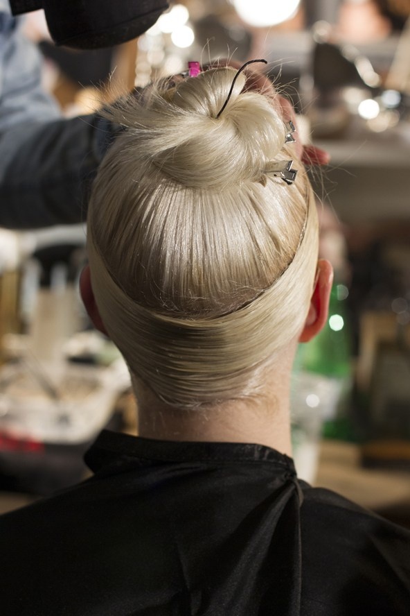 | Tóc người mẫu trong show Donna Karan được vuốt gel thật kỹ rồi cuốn quanh đầu, trong khi đó, phần tóc còn lại được buộc chặt và búi gọn lên đỉnh đầu. |
