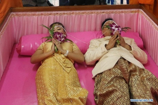 Khi cặp vợ chồng nằm vào quan tài, những nhà sư sẽ đậy một tấm vải trắng lớn trên miệng quan tài - một nghi lễ truyền thống trong những đám tang ở Thái Lan.