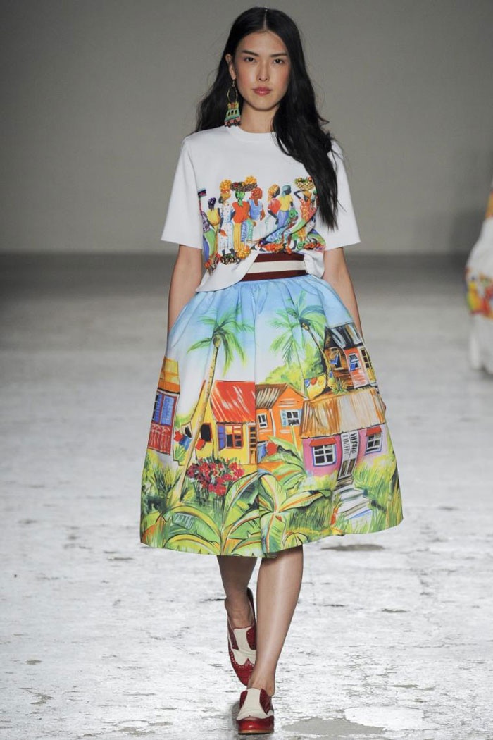 Xuân này sẽ thật tươi sáng nếu bạn quyết định mang họa tiết tranh vẽ phong cảnh rực rỡ vào set đồ chơi phố hay đến công sở của mình theo xu hướng mới nhất của Stella Jean. Các nhà thiết kế tài hoa của thương hiệu thời trang cao cấp này đã thổi hơi thở mới vào bộ sưu tập “ready to wear” trên sàn diễn Tuần lễ thời trang xuân hè Milan bằng cách đưa các hoa văn tranh vẽ cuộc sống và phong cảnh sống động vào trang phục. Kết hợp giữa những bức tranh cảnh làng quê vùng nhiệt đới bình dị, tươi rói trên khắp hành tinh, những chiếc xe buýt châu Phi đủ màu sắc…, với kẻ sọc ca rô hay chất liệu vải bóng rực rỡ, những kiểu váy đầm lộng lẫy và ấn tượng này sẽ giúp bạn nổi bật khi xuất hiện ở bất kỳ đâu, dù trên phố hay trong công sở.