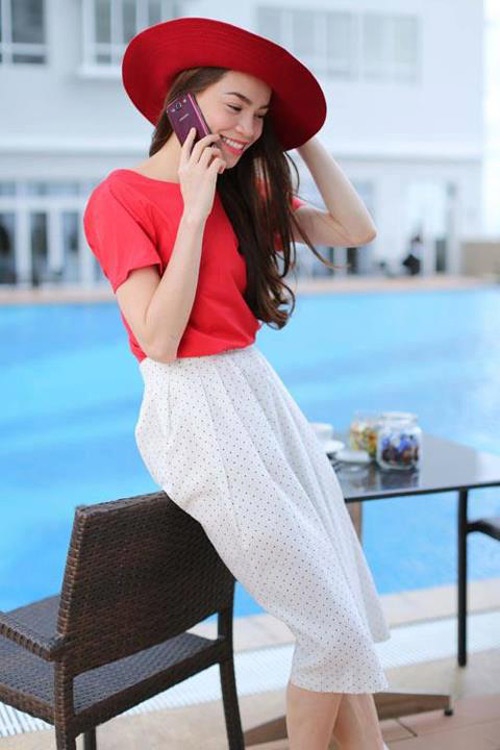 | Hà Hồ mix khéo léo mũ rộng vành với váy midi chấm bi và áo thun đỏ rực rỡ để tăng vẻ dịu dàng. |