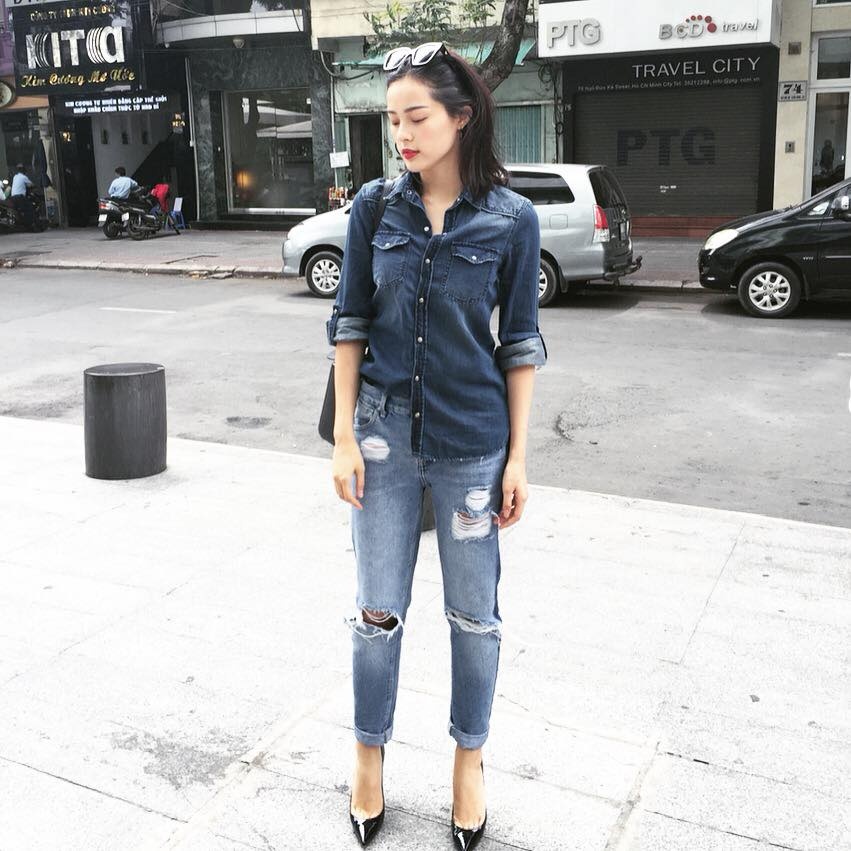 | Không chỉ là một tín đồ của sơ mi, Hạ Vi còn đặc biệt yêu thích phong cách trẻ trung của các mẫu sơ mi denim. |