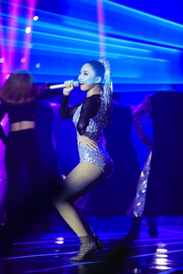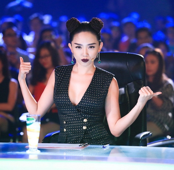 Tóc Tiên trẻ trung với phong cách làm tóc, trang điểm độc đáo khi ngồi "ghế nóng" giám khảo. |